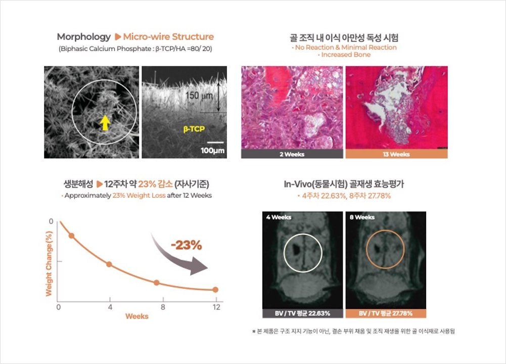 | Biphasic Composition | TCP + HA 혼합 | 단기 안정성 + 장기 골재생 |